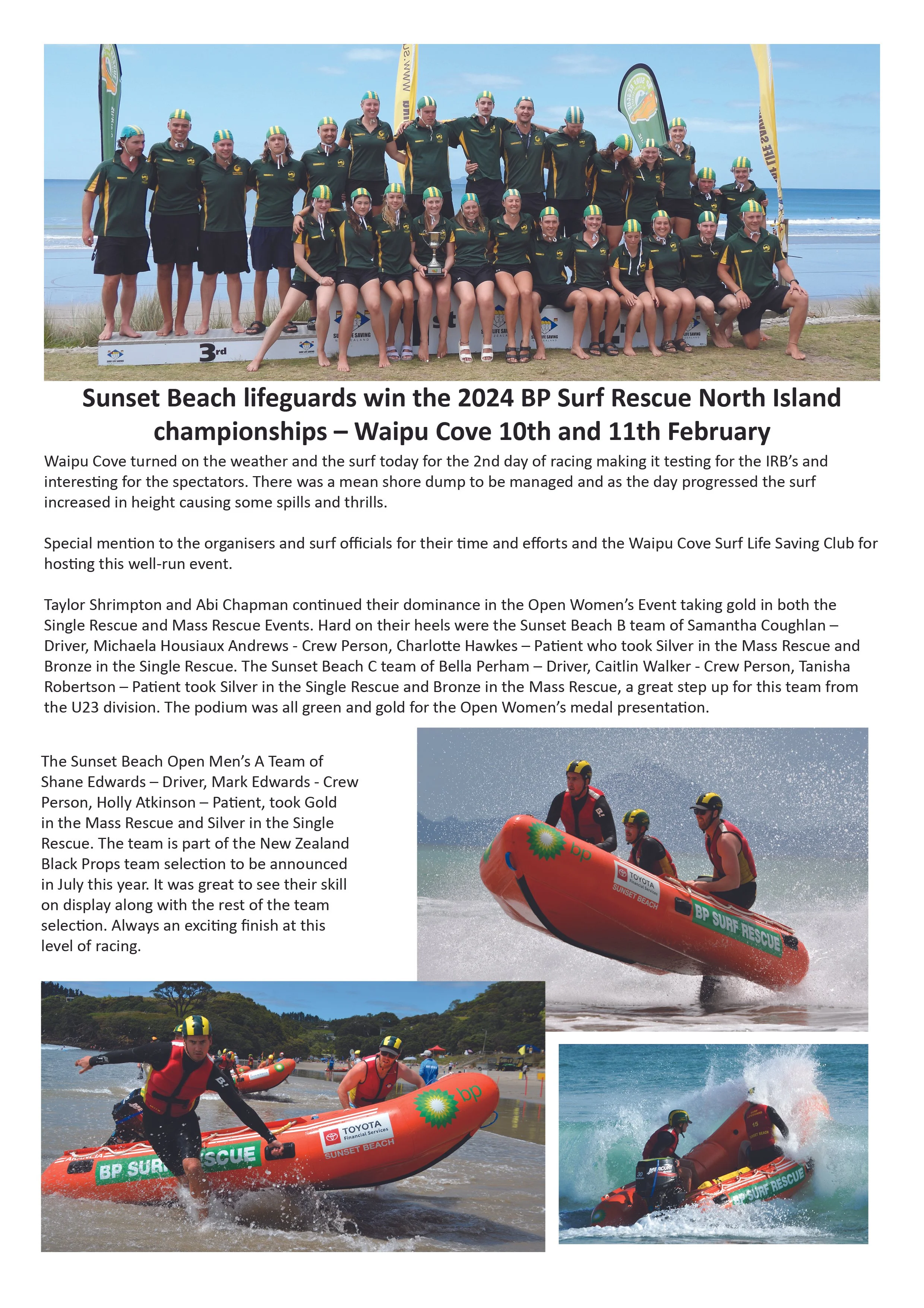 On Sunday 21/1/2024 at 7.30pm, off duty lifeguard Mikey Waldegrave was alerted to 2 people caught in a rip North of the carpark at Sunset Beach. He saw a hand go up and heard a scream for help. Mikey grabbed two rescue tubes and ran down to the beach. He swam out and rescued the two swimmers.